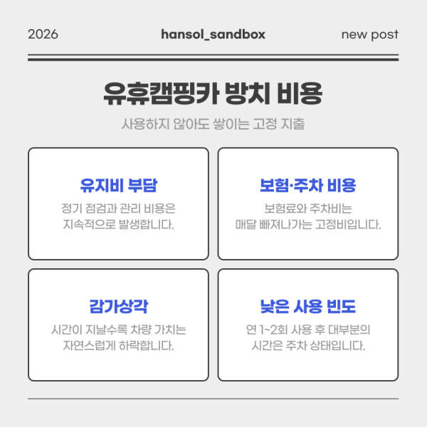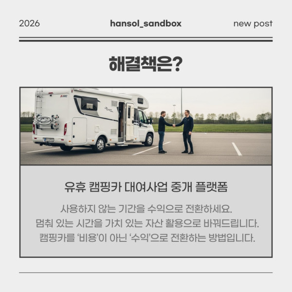유휴 캠핑카 방치 비용, 그대로 두고 계신가요? 페이지 정보 작성자최고관리자 댓글댓글 0건 조회조회 2회 작성일 26-03-10 16:44 본문 목록 다음글유휴자원 활용이 만드는 변화 – 경제와 여행을 움직이다 26.02.25 댓글목록 댓글목록 등록된 댓글이 없습니다.